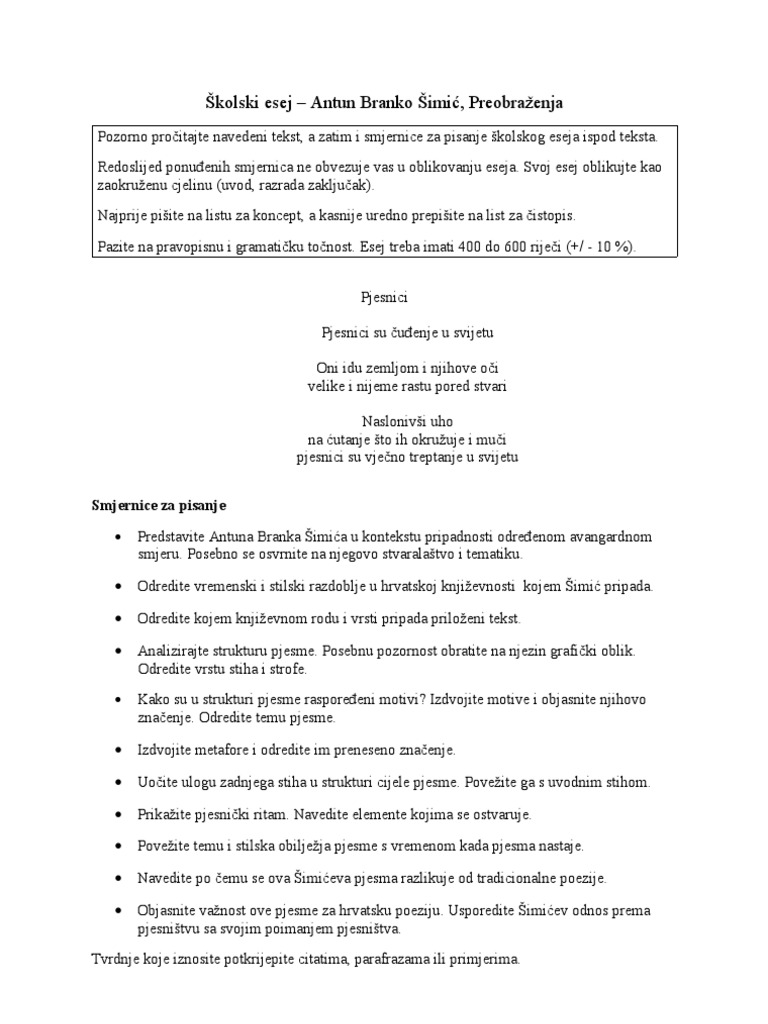 7 Skolski Esej Simic Pjesnici Tekst Sa Smjernicama