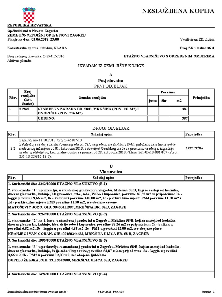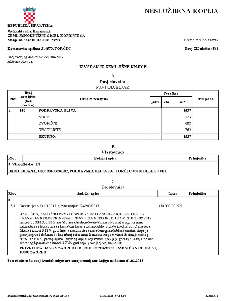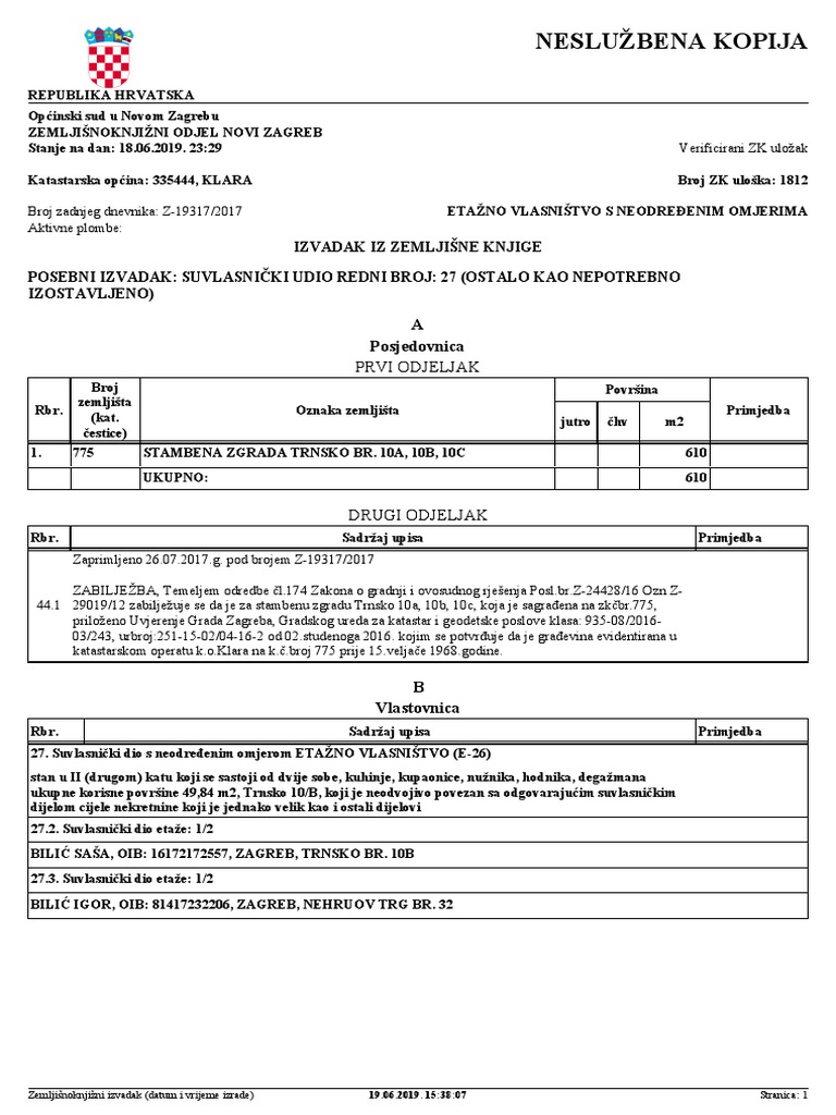 Zemljisne Knjige E Izvadak Detalji Uloska Gk Zagreb