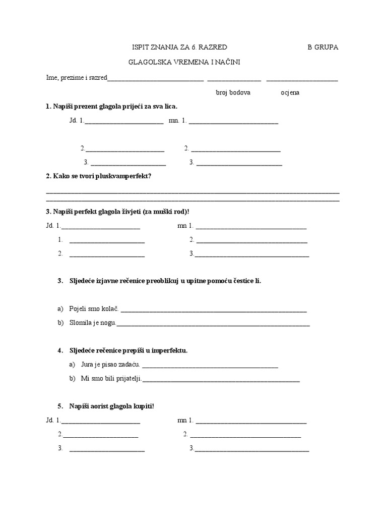 Glagoli Ii Dio Dopunski Rad Prijedlog Provjere Znanja Za 6
