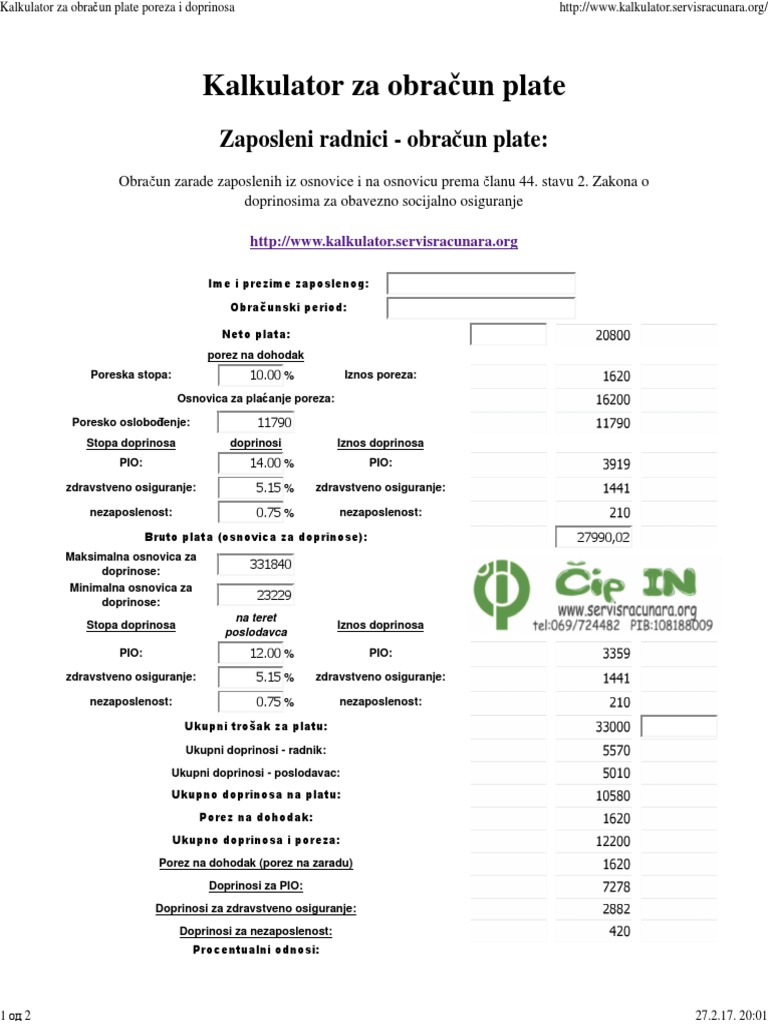 Kalkulator Za Obracun Plate Poreza I Doprinosa
