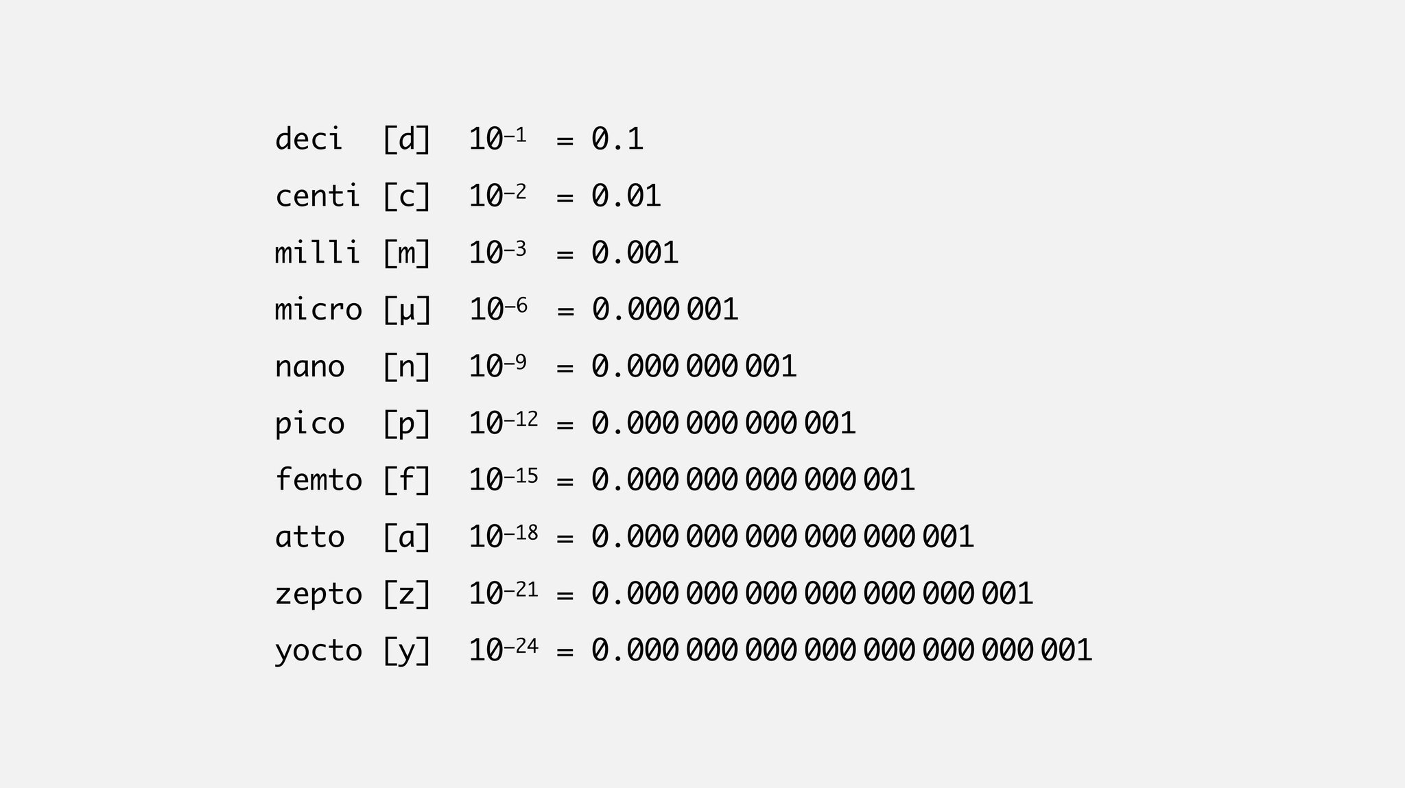 Fermat S Library On Twitter Metric Prefixes Fractional Deci D 0 1 Centi C 0 01 Milli M 0 001 Micro M 0 000001 Nano N 0 000000001 Pico P 0 000000000001 Femto F 0 000000000000001 Atto A 0 000000000000000001 Zepto Z